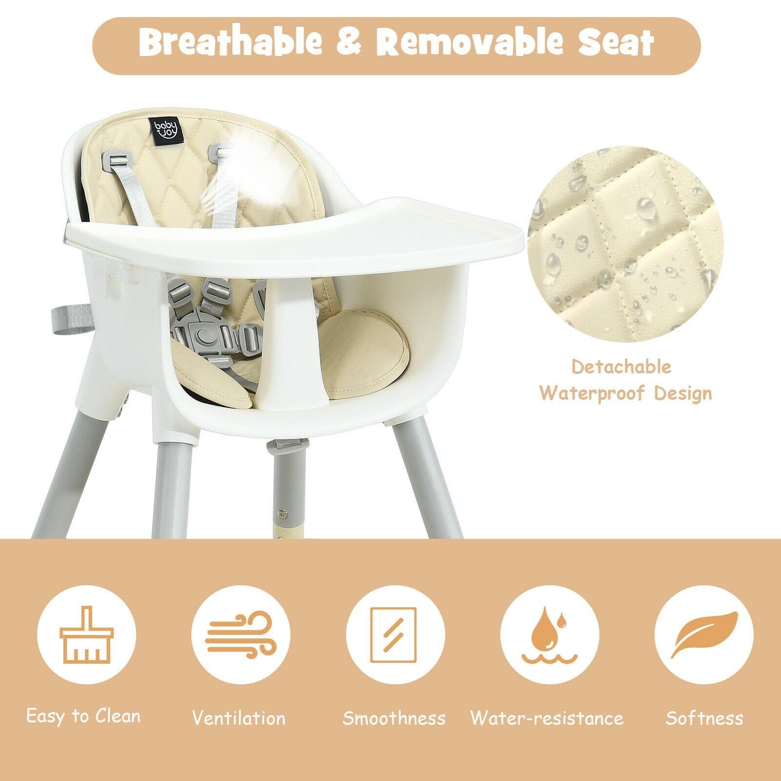 4-in-1 convertible design better meeting your baby's different needsAdjustable tray with two grades suitable for babies of different ages and needsEquipped with 5-point harness keeping your baby in safe conditionRemovable PU seat cushion is easy to detach and clean for a long time usePyramid structure ensuring the overall stability when in useLightweight design convenient for easy carrying and transportationSuitable for living room, bedroom, kitchen, etc. especially for narrow spacesEasy to assemble with its buckle design between chair and table