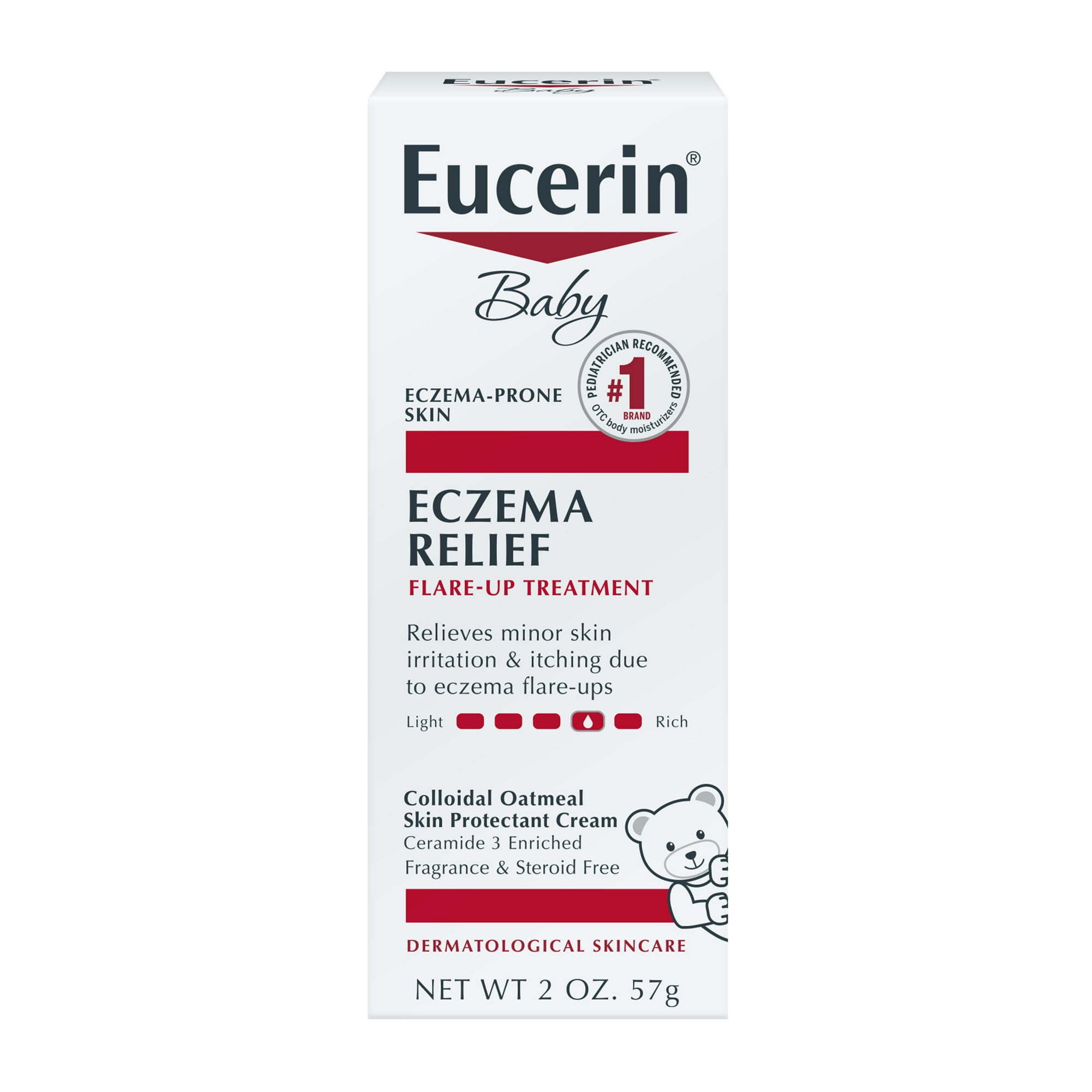 Eucerin Baby Eczema Cream Flare-Up Treatment is formulated with Colloidal Oatmeal (a skin protectant), Ceramide-3 and Licorice Root Extract