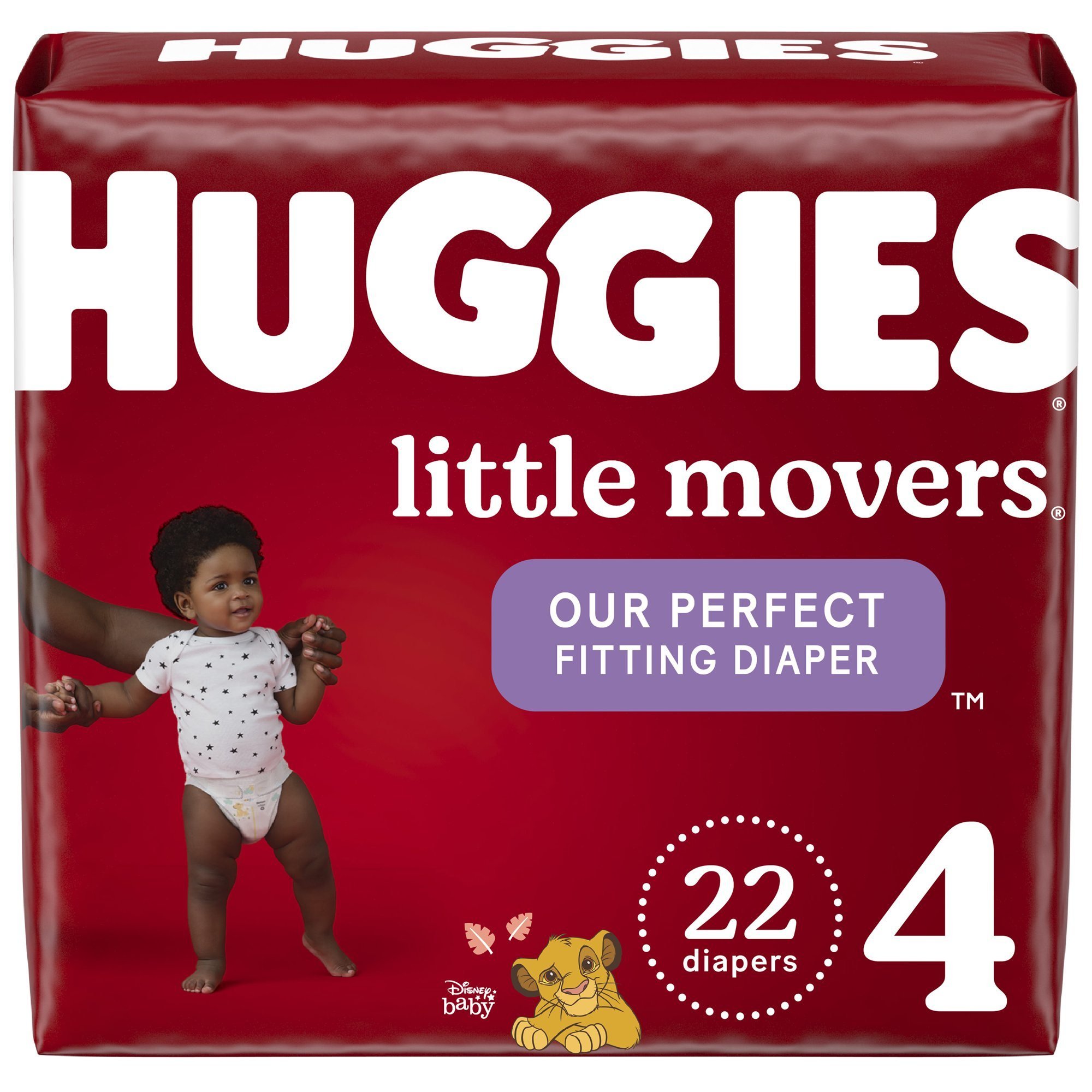 At Huggies; we know a comfy baby is a happy baby; and that's why Huggies Little Movers Baby Diapers are our most perfect fitting diaper; designed specifically for your active baby. Hypoallergenic and dermatologist-tested; these disposable baby diapers are free of fragrances and parabens; as well as elemental chlorine and natural rubber latex; making them safe for sensitive skin. Little Movers are made for worry-free running; jumping and playing; as they feature a contoured shape to offer red-mark free protection around the legs and a SnugFit Waistband that eliminates gaps around the legs and waist. The DryTouch Liner not only locks away 99% of wetness on contact; but also has extra protection layers to keep your baby's skin dry for up to 12 hours. Each baby diaper also comes equipped with a soft; back pocketed waistband that works to contain messes; even when your baby is on the move. With a wetness indicator of a yellow line that changes to blue when wet; you can easily know when your baby is ready for a diaper change; while the SizeUp indicator lets you know when it's time to move into the next size. Coming in adorable Disney's The Lion King designs; Little Movers Diapers are available in size 3 (16-28 lbs); size 4 (22-37 lbs); size 5 (27+ lbs); size 6 (35+ lbs) and size 7 (41+ lbs). Join Huggies Rewards+ powered by Fetch to get rewarded. Earn points on Huggies; in addition to thousands of other products to redeem for hundreds of gift cards. Download the Fetch Rewards app to get started today! (*Wet Fit; Among Open Diapers)