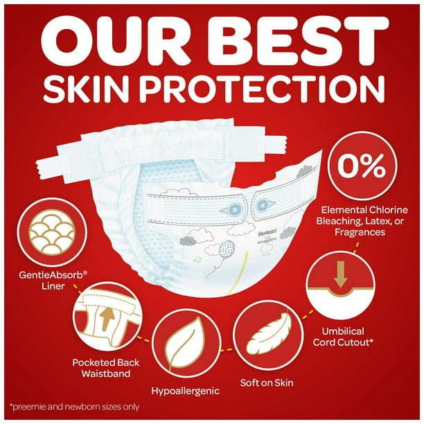 Huggies Little Snugglers Diapers are designed for sensitive skin; with premium softness and breathability to help keep your baby dry & comfortable. Huggies GentleAbsorb Liner provides a cushiony layer of protection and pulls moisture away from your baby's skin; while the Pocketed Back Waistband contains the mess and helps prevent diaper blowouts. Huggies absorbent Leak Lock System helps eliminate leaks for up to 12 hours of long lasting protection; plus a wetness indicator changes color when wet to let you know your baby is ready for a diaper change. Little Snugglers disposable diapers are hypoallergenic; fragrance free; paraben free; and free of elemental chlorine & natural rubber latex. In addition; preemie and newborn sizes have an umbilical cord cutout to protect your baby's belly button while it heals. Featuring adorable Disney Baby Winnie the Pooh designs; Little Snugglers Diapers are available in sizes Preemie (up to 6 lb.); Newborn (up to 10 lb.); 1 (up to 14 lb.); 2 (12-18 lb.); 3 (16-28 lb.); 4 (22-37 lb.); 5 (27+ lb.) and 6 (35+ lb.). Join Huggies Rewards to earn 10 points for every dollar spent on Huggies products. Points are redeemable for products; gift cards; sweepstakes and more. You'll also receive exclusive diaper coupons; offers and updates.