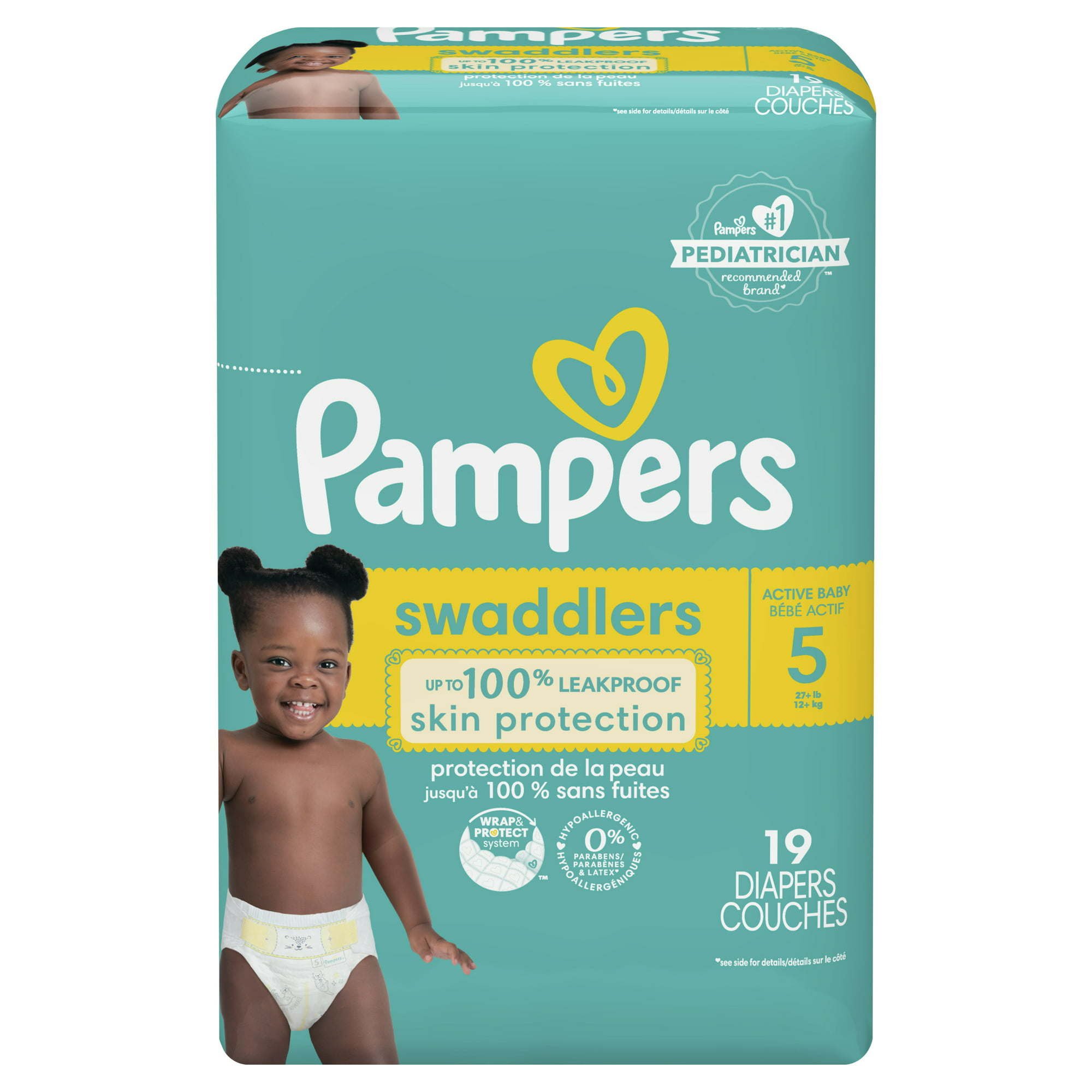 New & improved! Product and packaging may vary. What keeps baby's skin healthy? A diaper that doesn't leave skin wet. That's why new and improved Pampers Swaddlers absorb wetness better and provide up to 100% leakproof skin protection to help keep your baby's skin healthy and protected. New Pampers Swaddlers are designed with a Wrap&Protect Waistband that gently wraps around baby to help protect skin from irritation-and Wrap&Protect leg barriers that protect where leaks happen most.For trusted protection, trust Pampers Swaddlers, the #1 Choice of U.S. Hospitals, Nurses, and Parents.* Pampers LockAway Channels lock wetness away for dry, healthy skin while the BreatheFree Liner wicks away wetness, allowing baby's skin to breathe. Plus, Pampers Swaddlers are Skin Health Alliance Dermatologist Approved, hypoallergenic, and free of parabens and latex, so you can trust them to be safe and gentle on your little one's delicate skin. Pampers Swaddlers are available in sizes N-7 and come in a variety of sweet prints. For trusted protection, trust Pampers, the #1 pediatrician recommended brand.Download the Pampers Club App today and earn Pampers Cash!** Redeem your Pampers Cash for exclusive Pampers coupon savings and rewards! *#1 CHOICE OF U.S. HOSPITALS, NURSES AND PARENTS: Hospitals-based on hospital sales data; Nurses-vs. other hospital brands, among those with a preference; Parents-based on retail sales. 0% PARABENS AND LATEX: Latex-natural rubber. **Only redeemable via Pampers Club. No cash value.