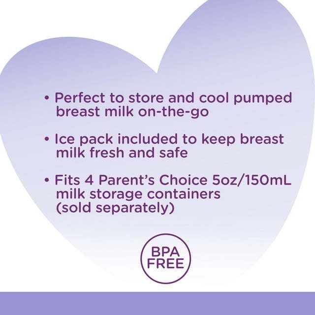 Our Parents Choice soft-sided Breast Milk Cooler Bag is compatible with the standard five ounce breast milk storage bottles by Parent's Choice as well as most other major brands. It provides a safe and sound storage solution fitting up to four breast milk storage bottles alongside the included contoured ice pack. When frozen, the ice pack provides hours of cooling time. Our Parent's Choice soft sided Breast Milk Cooler Bag also features a side note pocket that allows you to place critical reminders about its precious contents.