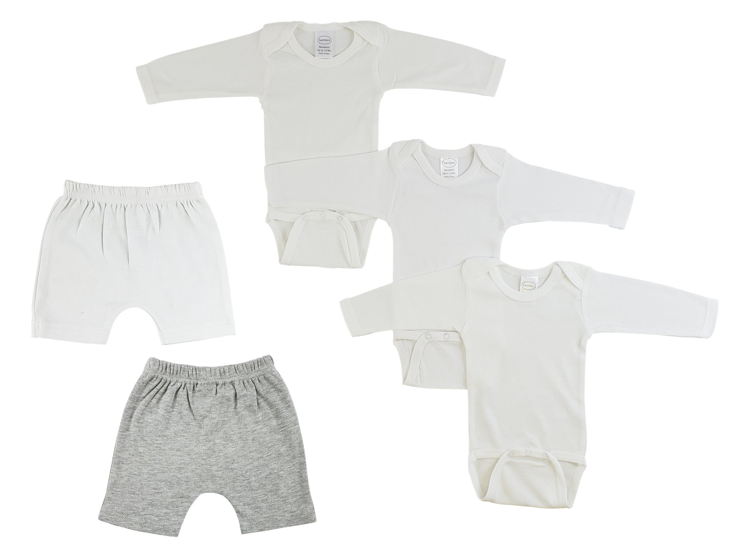 White Shorts (100% Cotton), Heather Grey Shorts (100% Cotton), White Long sleeve Onezie 3 Pack (100% Cotton)